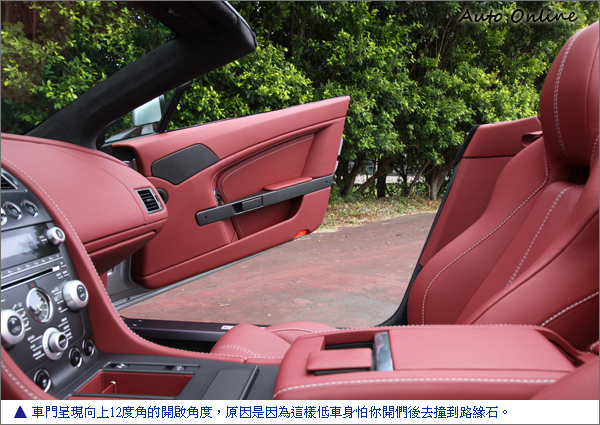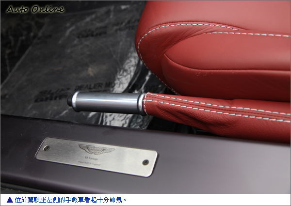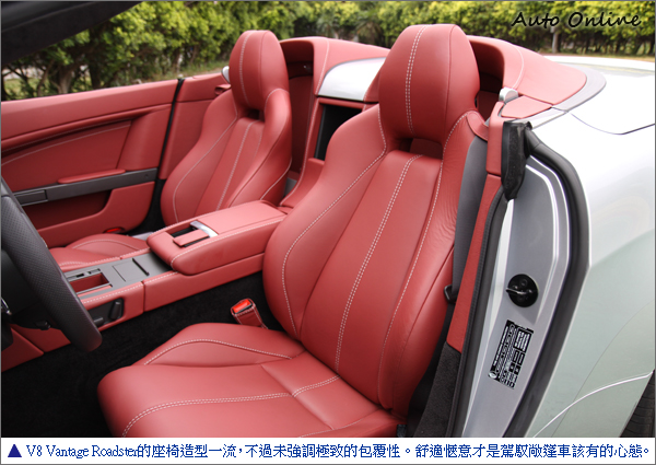V8 Vantage Roadster的車室用上大紅色的皮革,包括中控台、儀表板甚至是安全帶扣座通通以皮革細緻包覆。加上白色縫線的穿插讓Aston Martin外在優雅、內心情如火。當然如此等級的車款車主可以選擇你喜好的皮革顏色,縫線粗細等客製化要求。但Aston Martin幾乎已經是用打造精品等級的工法來造車了。舉例來說一塊小小廠徽也是由英國珠寶公司進行切削,再透過琺瑯彩的燒烤製作而成。細緻高質感的座艙風格果真是英系高級車廠的拿手絕活。