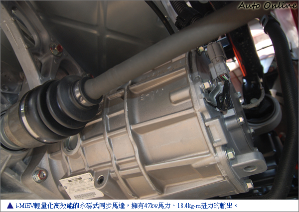 i-MiEV的後懸吊採用拖曳臂的結構設計,一方面簡單堅固,一方面也可保護驅動馬達與差速齒輪。i-MiEV輕量化高效能的永磁式同步馬達,擁有47kw馬力、18.4kg-m扭力的輸出。其線性化的加速表現,媲美一般2.0L汽油引擎的車輛。