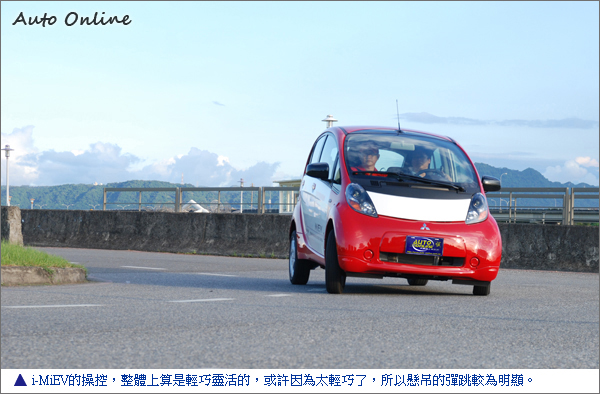 i-MiEV的操控,整體上算是輕巧靈活的,或許因為太輕巧了,所以懸吊的彈跳較為明顯。爬坡對i-MiEV來說不會太費力,僅管操作了陡坡中靜止再起步的動作,i-MiEV都能立即反應,若是一些輕排氣量的自排K-CAR可能就沒那麼輕鬆的立即反應了。