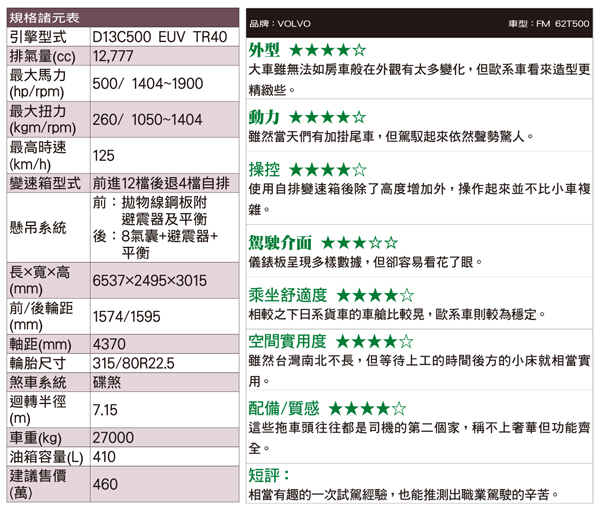 實際上路時我問袁教官市面上似乎還是以日系拖車為大宗,那麼像VOLVO FM 62T500這樣的車款要如何打動業者花錢購買?袁教官說基本上日車拖車頭售價是比較便宜一些,但像VOLVO FM不但比較省油,而且維修的周期也比較長,故障率也低。對於業者來說車輛時時保持在運作的狀態就是一種獲利。