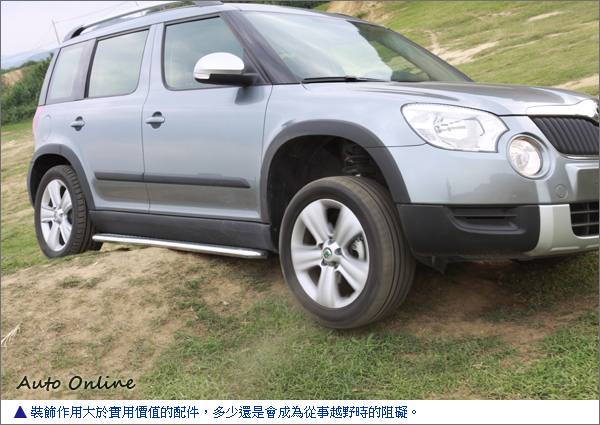 ![]() 在實際販售的車型上,中控台下方會發現多出一個OFF-ROAD越野模式按鍵,Yeti將OFF-ROAD ASR加速防滑控制、OFF-ROAD ABS緩坡輔助控制、OFF-ROAD EDS電子防滑差速輔助、上坡起步輔助、和下坡輔助等輔助系統整合為一,憑藉電子控制的能力,還是可以克服基本的障礙路況,只不過沒有辦法鎖定中央差速器,遇到車輪懸空或打滑時,就沒有太多脫困的籌碼了。