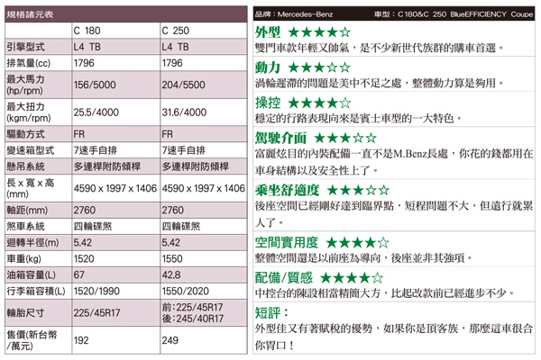 M-Benz的Coupe車型延續家族穩定的行路感受,外型夠漂亮內裝也有一定的水準。雖然動力表現不特別拔尖,但靠著排氣的優勢讓不是愛追求速度的車主來說提供更優質的賦稅優惠。如果說雙門轎跑車都是型男潮女的購車目標,那麼C Coupe算是裡面比較有節省概念一台!