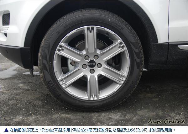 在Prestige車型上,加入了些些奢華元素的妝點,在車後的銘牌上,Prestige車型採用亮銀的EVOQUE徽飾,而在Pure和Dynamic車上,則分別採用黑底銀框和紅底銀框的EVOQUE徽飾,藉此不同色系同中求異的區分不同等級之車型。