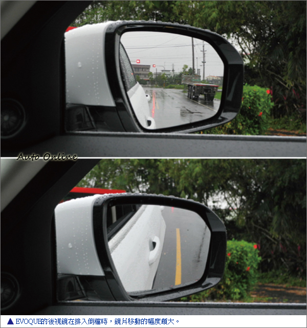 略高的駕駛座位是SUV的特色之一,不過RANGE ROVER EVOQUE特殊的高腰線設計,對駕駛兩側的視線略有影響,初上手時可得多花些時間來熟悉一下。另外,在排入倒檔時,兩側後視鏡會自下移讓駕駛較容易掌握車輛的位置,RANGE ROVER EVOQUE的後視鏡在排入倒檔時,移動的幅度頗大,加上高腰線的設計,猛然一看卻有不易辨識後視鏡反射影像角度的困擾,這也是需要多留些時間熟悉一番。