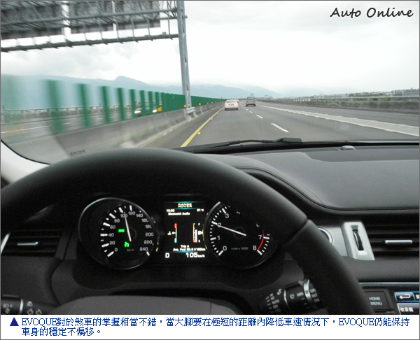 值得一提的是RANGE ROVER EVOQUE對於煞車的掌握相當不錯。試駕時難免會以高於速限的速度行駛,不過夜路走多總是會遇到鬼,在不經意下猛然看到一支固定式測速照相機後,勢必得在極短的距離內降低車速至速限內,雖然多年的經驗讓我大腳煞車下仍有所保留,不過RANGE ROVER EVOQUE在瀕臨輪胎鎖死的情況下,仍能保持車身的穩定不偏移,換做是它車或許在大腳煞車下已經開始左右擺動了起來,仍此顯見RANGE ROVER EVOQUE的煞車控制相當不錯。