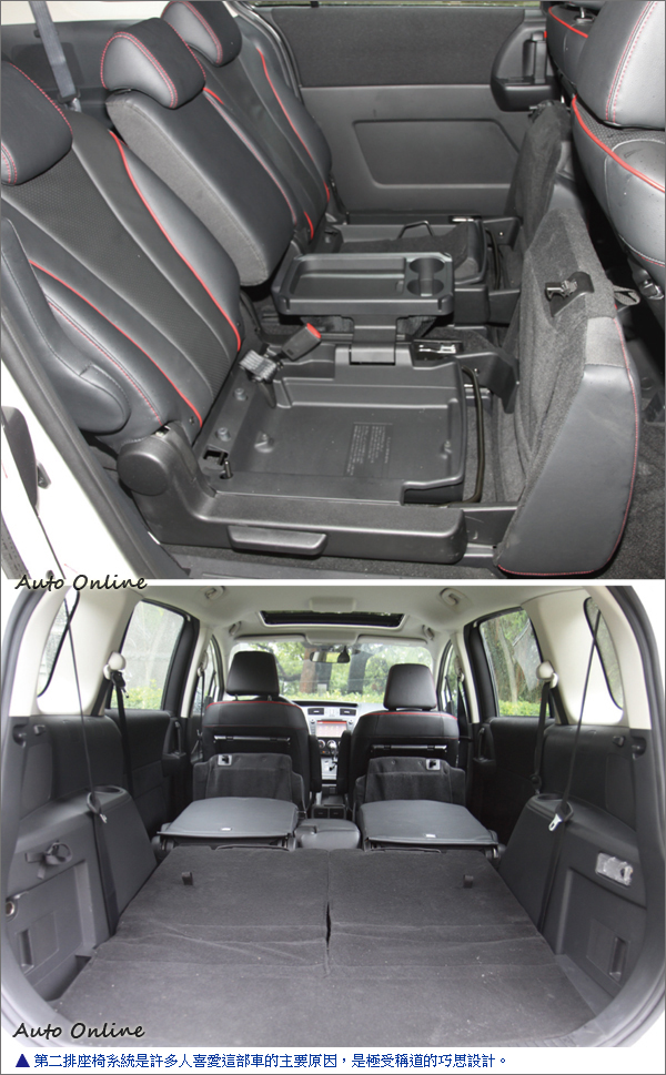 座椅全部攤平,就有超大的載物空間,全車多達10組置杯架,第二排座椅下方有隱藏空間,後座還有摺疊餐盤設計,論休旅機能,Mazda5可以輕易拿下滿分。