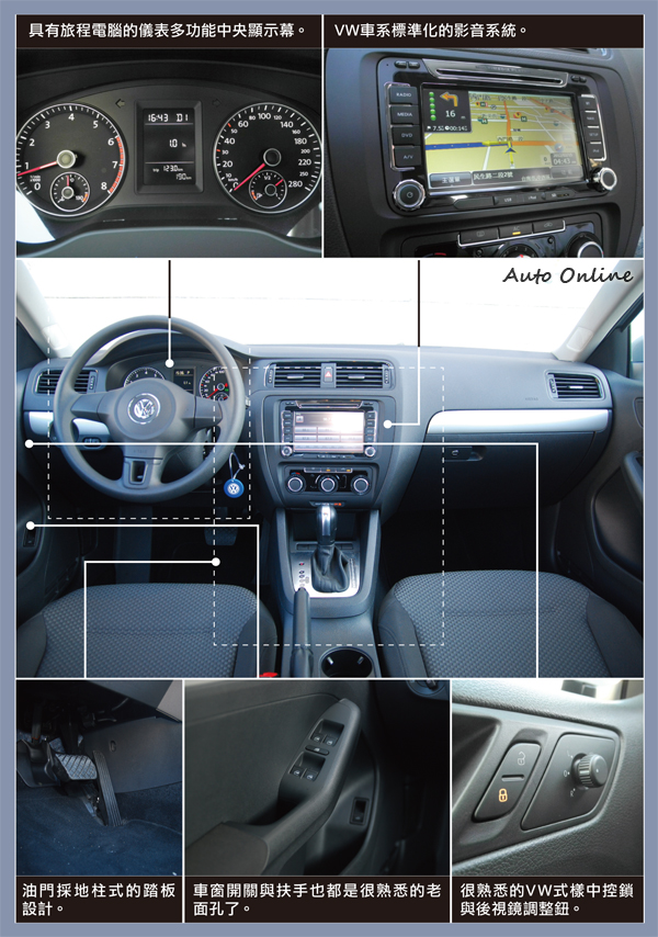 在內裝部份,新Jetta採用全新設計的中控台及儀表板造型,加上更紮實且更具質感的組裝用料,以及方便就手的駕駛艙規劃,讓消費者一進入車室內就能感受到德國汽車傲人的造車工藝,以及Volkswagen重視安全與環保的細部考量。