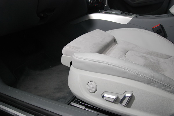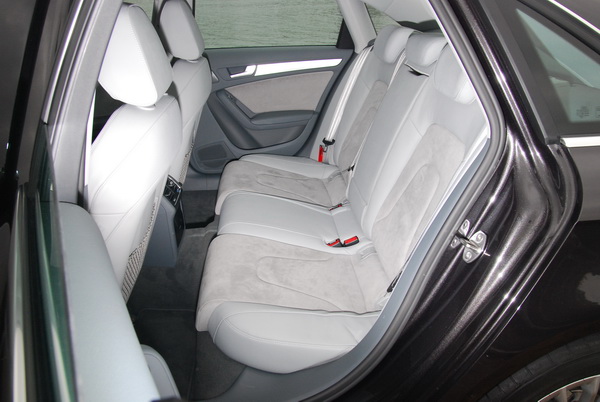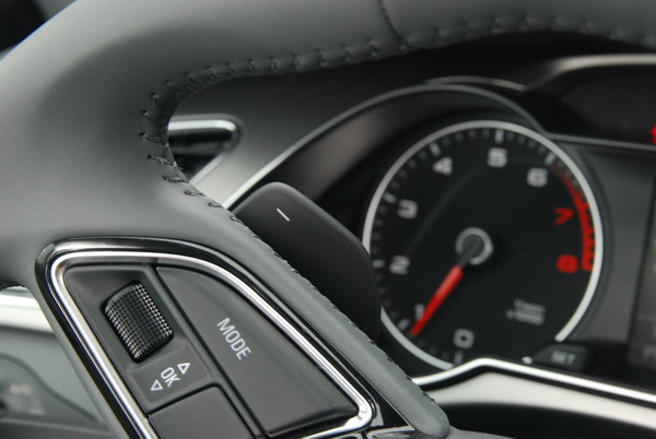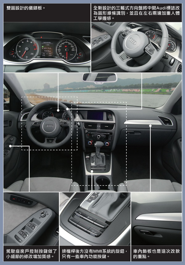 座艙部分,A4營造出飛機駕駛座艙的氛圍,從儀錶板的左側拉出一條弧線到MMI螢幕上方並在螢幕右側直下,將所有的控制介面都包圍在一起,這樣的設計感覺在哪出現過,沒錯就有點類似Audi當家超級跑車R8的設計。全新設計的三輻式方向盤將中間Audi標誌改為圓形線條識別,並且在左右兩邊加重人體工學握感,讓駕駛者在激烈操駕下更有手感,方向盤的三點鐘與九點鐘方向有換檔撥片。同時,排檔桿的造型更換為類似A6車系的相同款式,並且將Sport檔位與Drive檔位結合,駕駛需要進入S模式時,只要將排檔桿向下撥動就能進入S模式,如果再撥一次又會回到D模式,需要進入手動換檔模式可以從方向盤上的換檔撥片進行操作,或者將排檔桿往右撥就進入手排換檔模式,這樣的設計跟A7及A8相同。