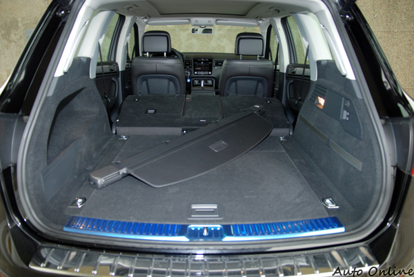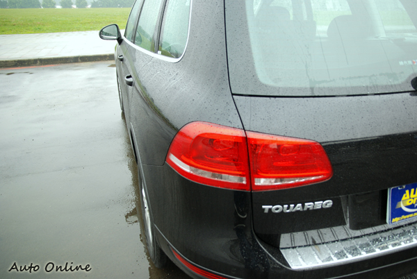 尾燈設計利用反光折線導出英文字「L」的光源,跟新一代Golf極為類似。排氣管為左右單出設計,下底板有類似後擾流的造型,姑且不談實質作用,在視覺上確實有增加Touareg的動感。