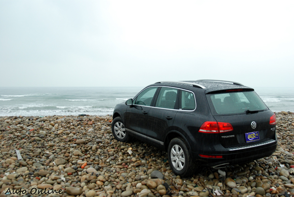 在綿綿細雨中試駕,將Touareg開往西濱的沙灘上,進入沙灘之前先把模式切進Off-Road模式,試駕車款並未選配高檔的越野功能,所以進入Off-Road模式後,車高並未改變(選配CDC主動式電子式氣壓懸吊系統,車高也可以跟著調整)。透過電腦精準的檔位配置以及控制輸出扭矩,駕駛輕鬆征服西濱旁的沙灘,但由於輪胎屬於一般街道用胎,在沙地的抓地力不足,如果坡度較陡的沙灘路面,輪胎與地面缺乏抓地力,還是會有「屌掐」可能。本刊編輯蔡喬治是資深的越野玩家,他認為如果Touareg可以換上一組輕越野使用的輪胎,就算沒有選配高檔的越野系統,還是一樣充滿樂趣。