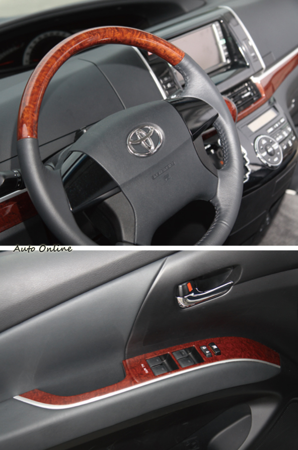 和外型比起來,TOTOTA Previa的內部格局雖然具備豐富的機能性,但論及視覺感就和「新潮」二字扯不上關聯了,可以說與這家車廠大多數的產品走的是相同的安全路線。在2.0L豪華版車型上,配置的環艙飾板、方向盤上半部、車門扶手及排檔頭,都採用深色木紋材質。作為一部家庭用車,原廠也體貼地在上方裝設了凸面鏡,提供駕駛可以監看後方孩童的狀況。