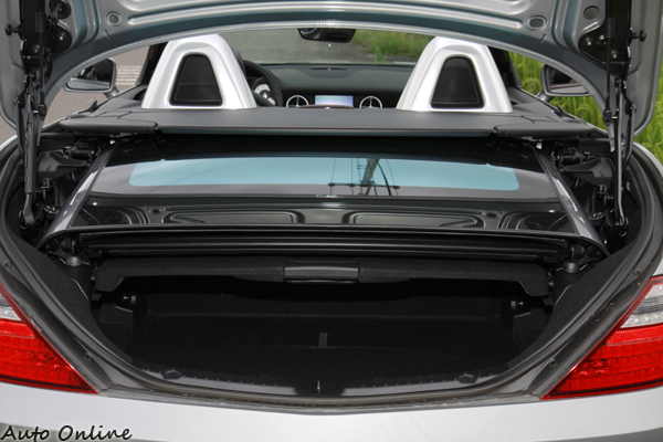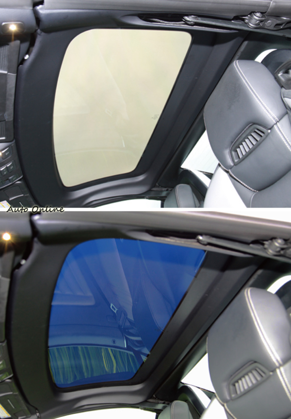豐富實用的配備![]() ▲平時熄火狀態,天窗會回到深色模式,這時外面是看不進去的。不過等到打開車門,才會發現這部Edition 1限量車的精華其實全在車內,首先看到的是位於車頂的天窗玻璃。有人或許會問,敞篷車能夠隨時掀開車頂,裝上天窗會不會多此一舉?何況它還不能夠開啟。會這麼想應該是不瞭解敞篷車買家的心態,因為這款限量SLK 350所用的並不是一般的染色採光聚碳酸酯材質而已,而是搭載了敞篷車首見的「MAGIC SKY CONTROL」科技。這個名字聽起來或許有點俗氣,不過實際運作卻很炫!因為賓士在玻璃中注入可透過電磁控制的分子,只要按下車頂按鈕,瞬間就能讓分子重新排列而改變玻璃的透明度。平時透明狀態就已經有部份隔熱效果,在深色模式甚至能隔絕熱能只剩下1/20。 ![]() ▲MAGIC SKY CONTROL到底有多神奇?深色模式下只有5%的熱能可以進入車內。![]() ▲開篷後的行李空間所剩無幾,想要塞進高爾夫球袋最好先關上車頂再說。