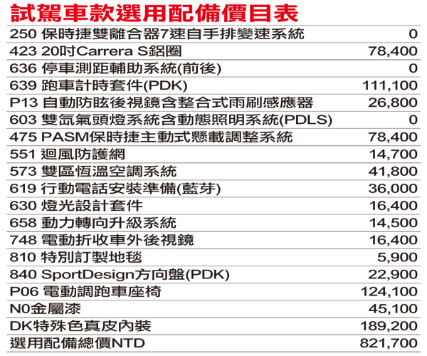 岔開話題我們要說的是基本上到PORSCHE展間沒有所謂的型錄,因為PORSCHE標榜一切都可以客製化。因此有些人會質疑PORSCHE用低的價位把顧客先騙進來,然後一切的東西都要加價。但在這裡必須要幫PORSCHE說話,其實這樣買空車再加裝的模式其實國外也是如此,而且這樣一來消費者的自主權還更大一些。 台灣賣車模式向來都是包套式的,也就是什麼版本會多什麼東西是車廠決定的,消費者只有接受或不接受,無法增減。但有時候你明明不愛官方配的皮椅想要有絨布椅,此時像PORSCHE用的模式還比較有自主權,但缺點是每台車由於客製化因此交車期就會拖比較久。