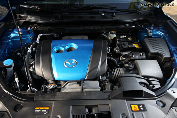 在SKYACTIV科技上可以分為SKYACTIV-G (引擎)、SKYACTIV-Drive(變速箱)、SKYACTIV-Chassis(底盤)及SKYACTIV-Body(車體)。CX-5動力上搭載全新設計的SKYACTIV-G科技引擎,最主要是提高壓縮比來提高汽油燃燒效率,增加引擎性能。不過提高引擎壓縮比最大問題就是高溫以及爆震,MAZDA為了克服引擎壓縮比所帶來的高溫與爆震,導入4合2合1的排氣頭段,這樣的設計可以降低排氣熱波回衝引擎汽缸增加溫度;噴油嘴改為六孔設計,增加噴油的霧化程度,以及在原本的凸頂活塞上挖凹洞,讓爆炸的火焰可以集中不影響汽缸本體的溫度。在機械運轉上,降低引擎運轉的機械摩擦,減少不必要的耗損,總總的進化就是要確保提高壓縮比後引擎不會因為產生爆震而發出問題。這樣的設計讓引擎壓縮比提高到14:1(傳統引擎大多為9:1或10:1),可惜的地方是部分市場因應油品的關係壓縮比降到13:1,當然也包括台灣。提高壓縮比的引擎配合可變正時汽門設計,最大馬力為154hp/6,000rpm、最大扭力為20.2kgm/4000rpm。