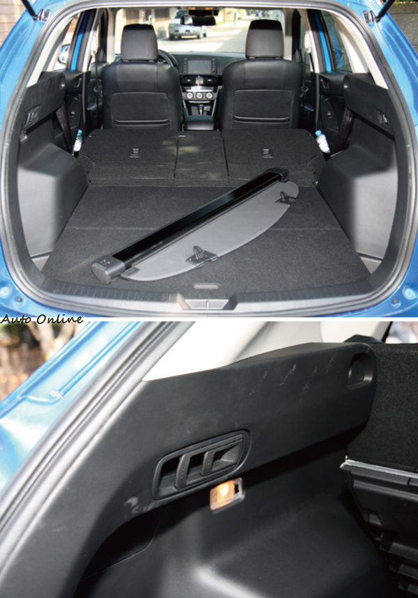 ▲CX-5後行李箱兩旁有快速傾倒按鈕,行李箱空間從403L瞬間變為1560L。