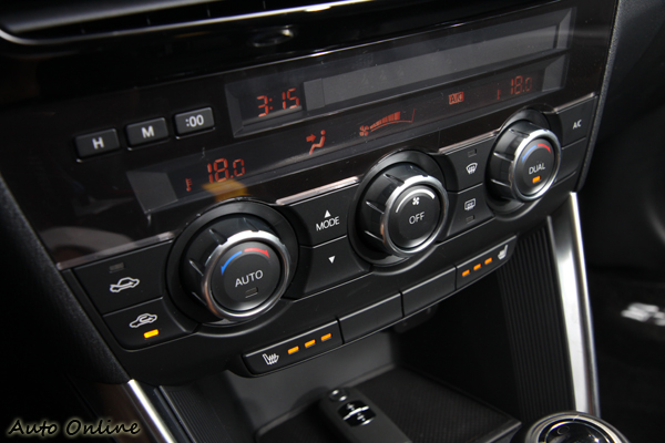 ▲左右雙區恆溫空調控制介面,下方有雙座椅的加熱功能,以台灣的天氣座椅加熱功能不太常用到。