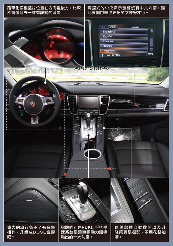 在這次加選的配件當中也增添不少電子配備,比方說駕駛座記憶套件、後座側邊氣囊、手套箱上方摺疊式雙杯架、雙氙氣頭燈系統、行動電話藍芽裝置、停車測距輔助系統 (前後)、全功能電動天窗、SERVOTRONIC 速度感應微調式動力轉向系統、BOSE環繞音場系統、真皮跑車方向盤含換檔撥片、電動後行李廂開闔系統、通用音源介面 (AUX-IN)以及CRP後軸5公釐輪圈墊片都是幫助駕駛使用車輛更為便利的配備。因此看完這麼長串的介紹之後這個Panamera Sport可真是料多實在啊!
