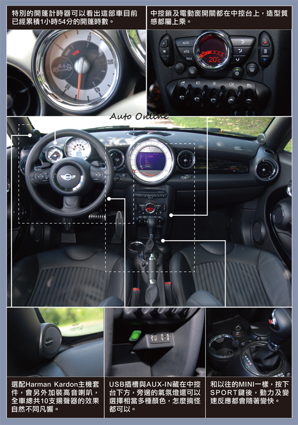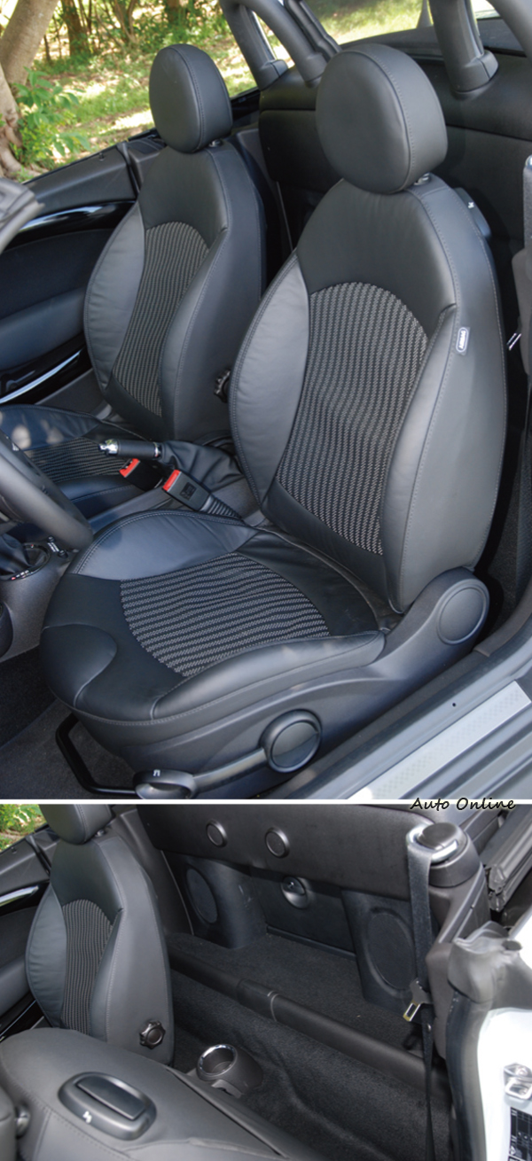 豐富的車裝配備![]() ▲透過“簡易版iDrive”控制鈕,就能使用各項整合系統,各種設定也都以圖像式呈現,相當方便。大量使用圓形儀錶是MINI的一大特色,駕駛座左方還特別設置了一套「開篷時間累計錶」,只要引擎發動時開篷,就會開始累計時間,除了趣味性以外,也鼓勵車主多多擁抱陽光。至於車速錶同樣位於中控台上,內嵌的螢幕除提供通訊和娛樂功能,也能設置車輛功能。 ![]() ▲開關篷控制位於後視鏡上方,尾翼控制同樣也在此處。![]() ▲跑車座椅後方仍有空間可以放隨身包包,打開隔板還能直接取出行李廂的物品。就算是標配的Roadster,也有可以支撐起售價的配備等級;在基本的定速裝置、引擎啟動/停止鈕、自動防眩車內後視鏡以外,也把6.5吋繁體中文影音整合系統納入標配,只需透過原廠連接線,就能讓iPod/iPhone/iPad中的影片在螢幕中播放,還提供藍芽免持及USB音源插槽。而試駕車在車室內也有幾樣選配,包括原本的真皮/織布內裝升級為Punch真皮內裝(NT$39,000),飾板也由黑色方格紋換成黑色鋼琴烤漆材質(NT$6,000),而且將音響升級為10支揚聲器的Harman Kardon主機(129,000)。 關於安全防護的等級,也是購買MINI的很好理由,全車六具氣囊和車門鋼樑以外,也有CBC(彎道煞車控制系統)、DSC(動態穩定控制系統),以及能避免前輪空轉,確保理想啟動狀況和充分的抓地力的ASC+T(全天候自動防滑穩定系統+循跡裝置)。此外還有上坡起步輔助、胎壓偵測警示系統、圖像式停車警示系統、失壓續跑胎等等,安全保護網在這個等級的車而言絕對是推頂之作。