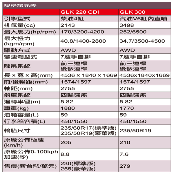 有效提昇動力效能![]() ▲GLK 220 CDI豪華版的最大扭力高達40.8kgm,而且在1400rpm就能獲得。GLK這次搭載的動力系統也進行了重新調整,其中GLK 220 CDI繼續使用2.2升4汽缸渦輪增壓柴油引擎,170hp/3200~4200rpm、40.8kgm/1400rpm的輸出功率不算令人驚豔的數據,就連官方測試數據0-100km/h需時8.8秒的結果,在眾家LSUV陣營中也不是亮眼的成績,很明顯,GLK並不是百米衝刺的好手。但若換成女性買家的角度,或是合宜的生活用車的觀點來看,低轉扭力好開的特性卻讓人滿意。如果能夠接受車外特有的柴油噪音,那麼應該更能享受這具引擎高品質的順暢運轉過程,嚴格說來,油門反應不夠即時的現象同樣存在於這款柴油車上,但一旦適應後就不會感覺困擾。 ![]() ▲原本的3.0升V6引擎年歲已高,已經由3.5升V6缸內直噴引擎取代,油耗更低。![]() ▲以轎車底盤改造的GLK開起來沒有一般高底盤車不安定的特點,相當好上手。![]() ▲GLK還是保留了相當程度的進入角、跨越角、離去角,4MATIC必要時還是很有本事。
