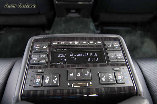 一進後座空間,發現後座空空如也,找不到任何一個控制的按鍵,把中央扶手放下,一切的問題都有了解答。扶手上佈滿密密麻麻的控制按鍵,包含座椅電動調整、按摩、通風功能,能從後座調整四區的冷氣空調,除此之外,連全車的音響系統都能從後座控制。