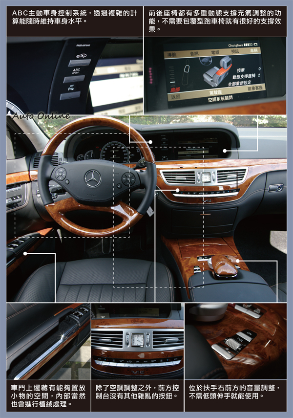 關上車窗後,整個車室隨即進入另一個世界,這種寧靜的空間並不是令人屏息的無聲,而是將吵雜的噪音隔絕,雙耳依然依稀可聽見引擎聲,不知是否錯覺,行經不良路面時的悶哼聲,甚至必須轉速拉高超過三、四千轉以上,V12引擎的特殊聲浪才會開始傳入車內,而且似乎不論駕駛方式多麼粗野,傑出的主動懸吊都能震動與頓挫柔化。還記得不久前在賓士駕馭體驗營中駕駛S600 L,在緊急閃避的項目中因為車速過快與操作不當而讓整輛車失控,整部車都已經側滑橫移甩出去,當時身體卻只是晃了一下,還搞不清楚發生什麼事,可見這套懸吊的效果有多驚人。