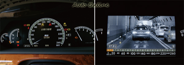 儀錶內的螢幕另一項重要功能是夜視系統,在隧道或昏暗的地方,按下左手邊的開關後,就可透過前擋玻璃上方的紅外線鏡頭,呈現前方影像。經由多次測試,效果相當不錯,黑白影像也不會受到強光車燈的影響,而且一旦感應到足夠照度,就會自動關閉。