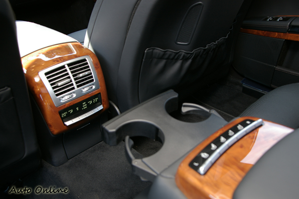 鞍座上的控制鍵安排也很簡單,只有座椅支撐控制、影音導航、音量調整和後座頭枕傾倒的控制鈕,其餘功能都已整合進COMAND系統內。至於M-BENZ車不可或缺的電話按鍵,在S-Class上早已化身為仿手機樣式,就安置在扶手前方。