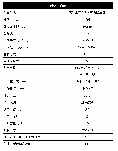 ![]() ▲2.0XT帳面的馬力數據比以往2.5XT更好,搭配CVT無段變速自排系統,節能表現更佳。內在方面的變革方面,先進動力科技帶來的進步明顯可見,這款2.0XT使用的是FA20水平對臥四缸DIT缸內直噴渦輪增壓引擎,不過動力調校與日規版本不同,台灣車型最大馬力是240ps/5600rpm,最大扭力35.7kgm/2400-3600rpm,並且搭配CVT無段變速系統,換句話說,就是先前發表的亞太車型規格。和前一代的2.5XT(EJ25)+4AT比起來,FA20+CVT無論馬力或扭力都勝出,0-100kph加速表現也快了0.4秒,僅需7.5秒就能完成,除了更省油,稅率等級也佔了更多便宜。然而實際駕駛中卻發現2.0XT在中低轉速時的推力不夠理想,渦輪產生的力道必須拉轉至3000rpm以上才會明顯湧現,如果爬坡超車的加速沒有一氣呵成,渦輪遲滯的現象會讓人有點尷尬,這難道是降低排氣量後帶來的負面影響?