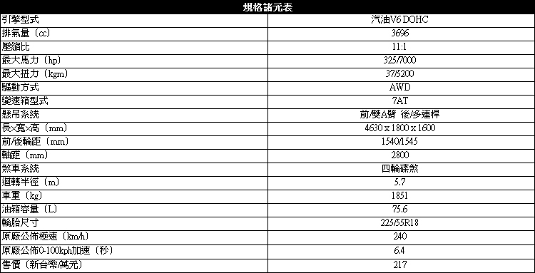 經過升級後,EX37的最大馬力已經從EX35的298匹增加到325匹,扭力也達到37.0kgm,配合七速手自排,能源局測得的平均油耗也有10.4km/L的水準。雖然買家每年也必須多付出1350元的燃料稅,不過對於這樣的200萬等級豪華車來說,相信這不會構成太大困擾。