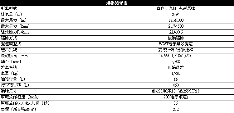 Hybrid油電動力動靜皆宜![]() ▲IS 300h F SPORT加速力道充足,不過礙於ECVT變速箱,樂趣無法徹底發揮。動力上IS 300h F SPORT搭載一顆直列四缸的自然進氣引擎(代號2AR-FSE)與兩顆永磁電動馬達,這顆2AR-FSE引擎是特地為IS 300h F SPORT重新設計,提高D4-S缸內直噴壓力,得到更好的馬力輸出與油耗。純引擎最大馬力為181ps/6,000rpm,最大扭力22.5kgm/4,200~5,400rpm,如果加上電動馬達的動力綜效馬力有223ps,綜效扭力高達30.6kgm,靜止加速到100km/h花費8.5秒,極速設定在200km/h。變速箱使用一顆ECVT電子無段變速箱(可模擬六速換檔模式),加速感受綿密不會有傳統自排變速箱換檔時的頓挫,Hybrid系統搭載ECVT變速箱已經成為LEXUS不變的定律。 ![]() ▲將Hybrid電池改到備胎放置,後座椅背可以採6/4分離擴充行李廂空間。