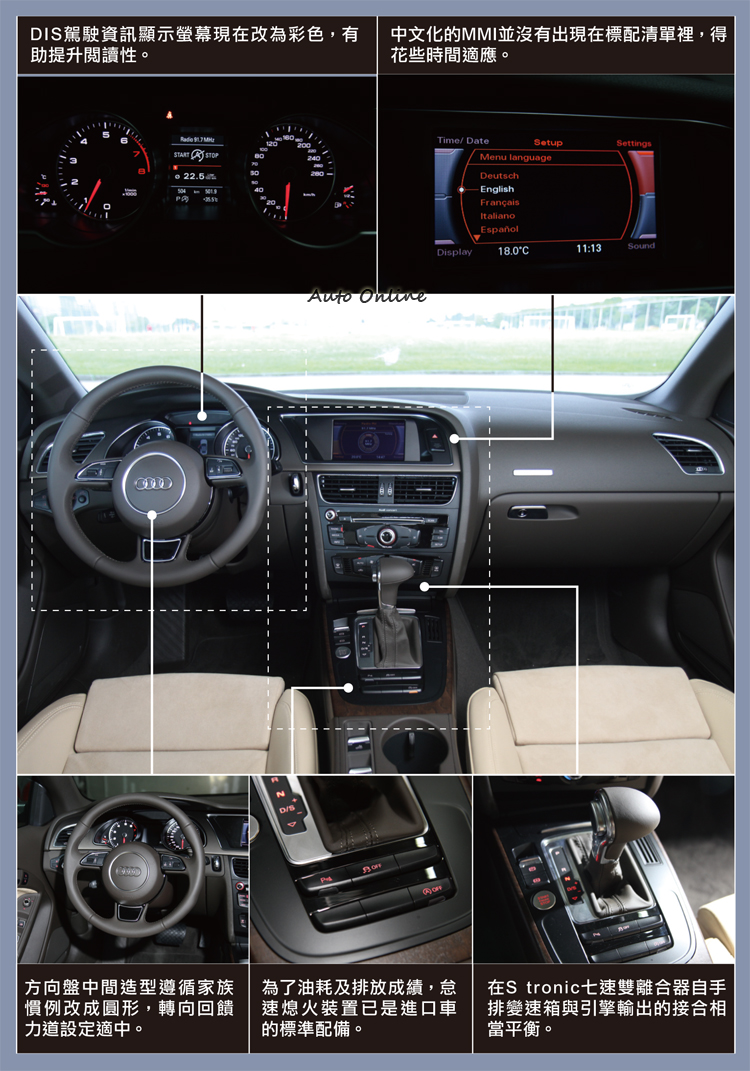 不過先前我們曾提到往後的Audi車款所搭配的MMI都會中文化,但A5 Cabriolet並沒有中文選單。經詢問後這款車也不會搭配中文化MMI,所以在操作上駕駛得先孰悉一下英文或其他語系的介面。