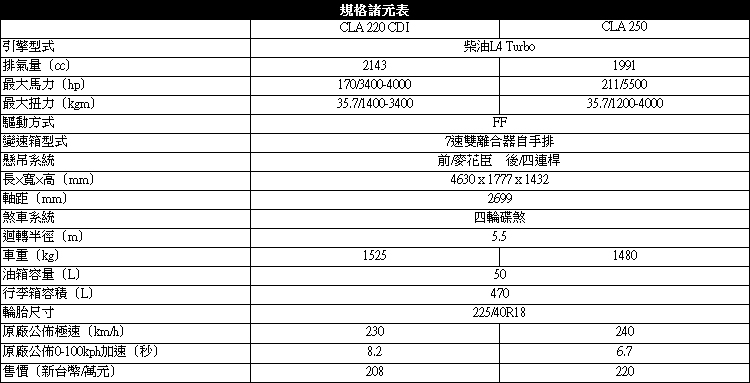 目前業者引進的車型只有兩款,也就是柴油CLA 220 CDI與汽油CLA 250。CLA 220 CDI搭載的引擎就是170hp最大馬力的2.2升四缸柴油引擎,35.7kgm的峰值扭力當然是它的賣點之一,不過23.8km/L的歐規平均油耗表現更令人佩服。CLA 250則是搭載2.0升渦輪增壓汽油直噴引擎,最大馬力211hp,最大扭力同樣為35.7kgm,原廠公佈的歐規平均油耗是16.4km/L。兩款車都具備ECO Start/Stop引擎怠速節能啟閉功能,並且搭配七速7G-DCT雙離合器變速系統。