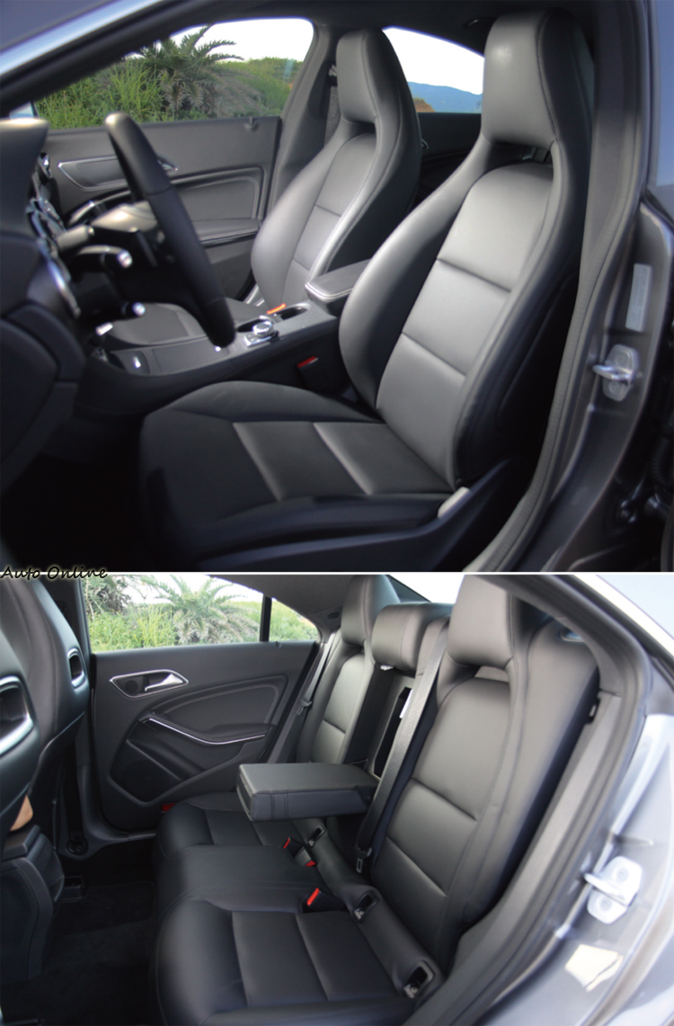一體式跑車化座椅也是許多人關注重點,高椅背與三區縱列式設計為其特色,四向腰靠設計並附三組記憶功能,除了一般的對比車縫線,CLA 250的AMG跑車化套件會將縫線換成紅色。後座雖然有三頭枕,不過建議還是最多兩位成人乘坐比較剛好,由於車型尺碼偏小,乘坐空間的表現並不理想,特別是頭部受到壓迫的情形會比較嚴重,基本上以這類個人自駕車型來說,這方面不用太期待。