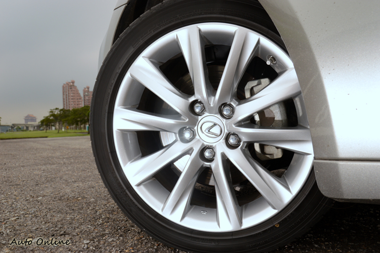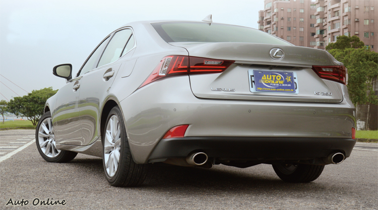 減少銳角 簡潔有力![]() ▲IS 250前氣壩有配置霧燈,水箱護罩的呈現方式也與IS 300h F Sport不同。拋開之前對IS 300 h F Sport的成見,重新再來一次與IS 250 Navi版本的邂逅。在外觀上這次IS 250並沒有搭載F Sport空力套件,前保桿的線條比較內斂,兩者最大的差異就是前氣壩有沒有配置霧燈以及水箱護罩的呈現方式不同。相同的地方都具有「勾勾」LED日間行車燈與不規則的大燈燈殼。IS 250前保桿沒有過於繁瑣、複雜的線條,比較符合Lexus該有的成熟、內斂風格。將目光移往車側,車側平整的車門線條是Lexus的傳統,全新IS只看得出誇張的側裙造型,另外IS 250沒有油電混合系統,所以在側裙上拿掉了Hybrid的銘牌。 ![]() ▲IS 250排氣管採左右雙邊單出設計,這絕對是跑格化轎車該有的造型。![]() ▲鋁圈採十輻式造型,規格前後一樣,尺寸為225/45R17。