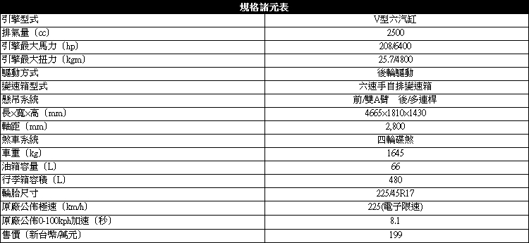 V6引擎加六速手自排-絕配![]() ▲IS250搭載一顆排氣量2.5L的V型六缸汽油引擎,最大馬力為208ps/6400rpm以及最大扭力25.7kgm/4800rpm。IS250搭載一顆排氣量2.5L的V型六缸汽油引擎,搭配D-4缸內直噴系統,最大馬力為208ps/6400rpm以及最大扭力25.7kgm/4800rpm。變速箱使用一顆六速手自排變速系統,最大馬力雖然比不上IS 300h的綜效馬力,在六速手自排加持下,靜止加速到100km/h只要8.1秒比IS 300h F Sport還快0.4秒。實際試駕,IS 250帶來的樂趣遠遠超過IS 300h F Sport,第一,V型六缸的汽油引擎不需要引模擬器,就能有好聽的引擎聲浪,而且不會擾亂駕的判斷力。第二,六速手自排變速箱的加速反應直接,沒有CVT的奇怪邏輯,駕駛能夠固定檔位得到最佳的加速表現。 ![]() ▲在六速手自排的加持下,提升了IS 250在山道的樂趣。