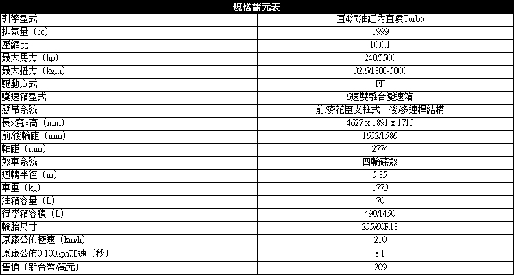 當初這個2.0升渦輪增壓引擎的推出後沒多就及取代的過去頂級的3.2升引擎。在動力科技的提升下240匹的馬力與32.6kgm的扭力輸出還是相當夠用。在變速箱的部分Powershift 6速雙離合變速箱也提供車輛相當適時的協助,讓行車順暢度有著合宜的表現。