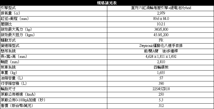 渦輪+電動馬達=節能樂趣兼具![]() ▲媲美E46 M3的輸出動力,最大性能輸出為340hp/45.9kgm。BMW ActiveHybrid 3搭載一顆N55直列3.0L的六缸雙渦流渦輪增壓引擎與電動馬達,如果單純以內燃機的數據來看,不難發現引擎部分與同車系的335i相同,同樣都使用HPI高精準缸內燃油直噴以及VALVETRONIC汽門揚程可變系統等多樣科技輔助,但是在電動馬達加持後,ActiveHybrid 3綜效馬力為340hp/5800rpm以及最大扭力45.9kgm/1200rpm。變速箱一樣使用Steptronic運動化八速手自排系統,馬力較大的ActiveHybrid 3但受限於車重增加影響,靜止加速到100km/h的表現與335i幾乎相同為5.3秒。 ![]() ▲ActiveHybrid 3加速感就像335i瞬間渦輪開啟在加上一顆電動增壓器,從靜止一路攀升,絲毫感受不到疲態。