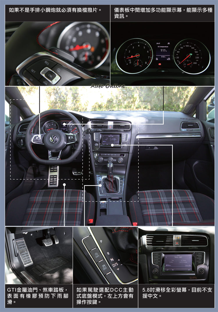 GTI不敗神話繼續延續![]() ▲七代Golf GTI顯得靈活許多,尤其是在多彎的山路上,多給駕駛幾分信心繼續踩下油門。繼續踩下油門。全新第七代的Golf GTI,在外型上比起上一代更具有跑格動感,操控表現明顯大幅提升,這些改變相信會讓VW車迷對於GTI愛不釋手;不過在一天試駕過程中,感受到GTI刻意降低它在聽覺上的享受。記得在試駕六代Golf時,拉高轉速的高亢排氣聲浪,換檔時後方還會出現「砰」一聲的聲響,在第七代Golf GTI不復見,這些讓人亢奮的聲浪被壓低了!但原廠宣稱,這一代在車內有安裝引擎聲浪傳導氣,將膨湃的引擎聲浪傳至車內,老實說效果並不明顯。 ![]() ▲外觀看似全景天窗的設計,其實只有一般的天窗大小。![]() ▲以小鋼炮自居的GTI,在實用性上依舊不減。