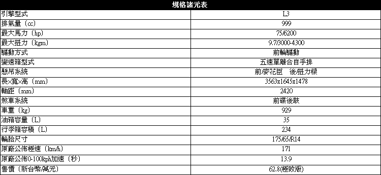 ▲車輛動力來自這顆999c.c 75匹馬力的直列3缸引擎,官方所公佈的油耗成績可達20.1km/l。