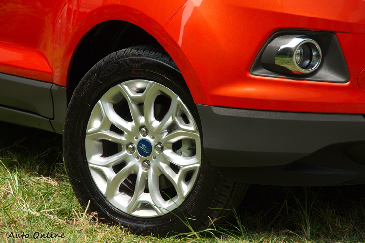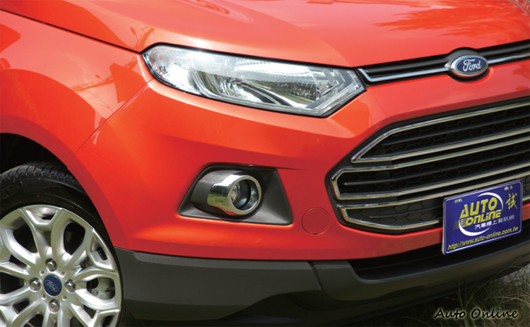 融入休旅風格的挑高Fiesta![]() 外觀上,EcoSport是採用了福特Kinetic Design 2.0版的設計手法,所以幾個外觀細節元素與採用1.0版設計的國內現行Focus、Kuga等車款有點不大一樣。但是若拿來與國外新改款的Fiesta相較一下就可以發現一些共通性:細長的頭燈與輪廓像ASTON MARTIN的大嘴水箱罩。而在頭燈之間再以一段細橫柵來搭配廠徽。頭燈下方以梯形外框搭配圓形前霧燈還頗有運動感。 ![]() ▲纖細的頭燈搭配下方的圓柱造型霧燈。![]() ▲配胎尺寸為205/60R16,當然,是道路胎非越野胎囉。![]() ▲尾燈面積頗大,與外掛的備胎殼幾乎就佔滿車尾的視覺。