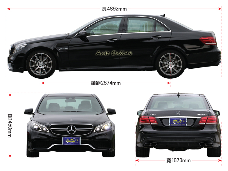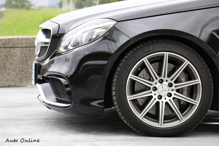 車頭比較明顯的差異,是在下氣壩造型,E63 AMG有寬闊的進氣設計來應付,象徵AMG的「A」型翼板兼具穩定車頭、降低抬升力的功能;車側除了「V8 BITURBO」字樣,外擴葉子板和AMG輪圈、卡鉗碟盤組也能看出它的特殊身份;