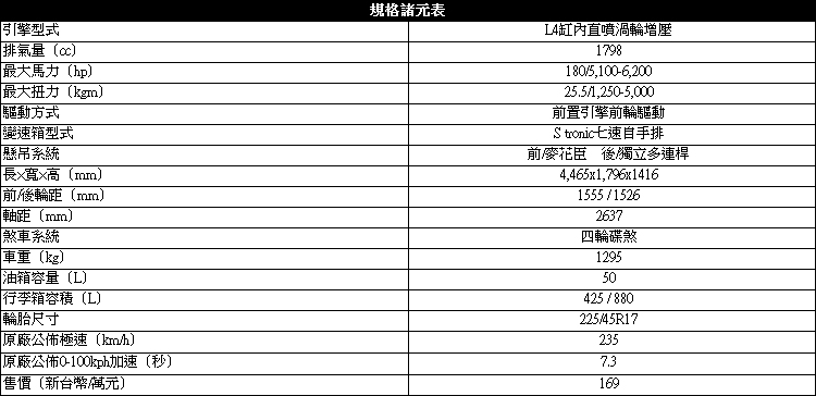 舒適與樂趣兼具![]() ▲穩定好上手向來是Audi車系的一貫特色,延續MQB底盤紮實又服貼的循跡表現。相較於A3 Sportback寬上些許的後軸,注定了其偏向穩定的彎道操控反應。的確,在蜿蜒又刁鑽的山路上,A3 Sedan 1.8TFSI後軸沒有讓人心驚動魄,或說蠢蠢欲動的靈活特性,而是延續MQB底盤那紮實又服貼的循跡表現。但受惠於車身尺碼設定,A3 Sedan 1.8TFSI沒有那種慢上半拍的過彎反應,仍有著俐落與精準的轉向手感,更重要的是,延續Volkswagen集團一貫的高度親和力,幾乎不用任何適應時間,你一握上方向盤,過了幾個彎之後,你很快就可以知道A3 Sedan 1.8TFSI的極限與特性,接下來,就是好好享受通過每個彎道的時刻。 ![]() ▲A3 Sedan目前共有1.4TFSI與我們所試駕的1.8TFSI,輪胎尺寸分別為205/55/R16與225/45/R17。