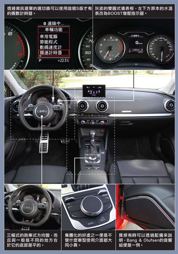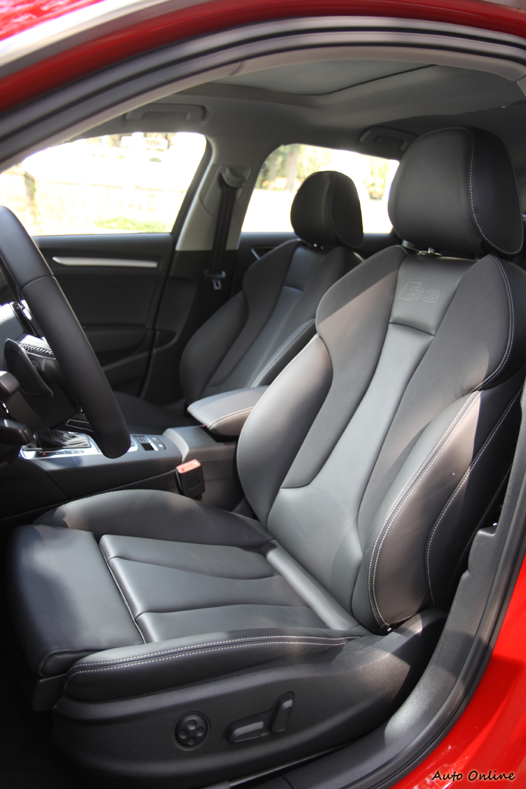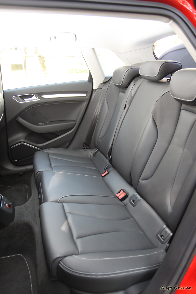 儀錶板的配置同樣採雙圓中間搭配一個液晶行車資訊顯示螢幕。不過為了突顯運動性,S3 Sportback在雙圓指針儀表的底部用上灰色底色配色,一旁還有S3的字樣。原本左下方的水溫指示計到了S3上改為BOOST指示,官方表示該車最大增壓值可達2.0BAR。此外若進入資訊選單你會發現在S款上會多了一個圈速計時器,不過必須要手動開關,實際操作上還是有那麼些不順手。 ![]() ▲相當有型的跑車化座椅,上方還有專屬的S3字樣浮雕。![]() ▲後座空間表現不至於到有壓迫感的程度,但一樣偏直立的椅背坐久不大舒服。