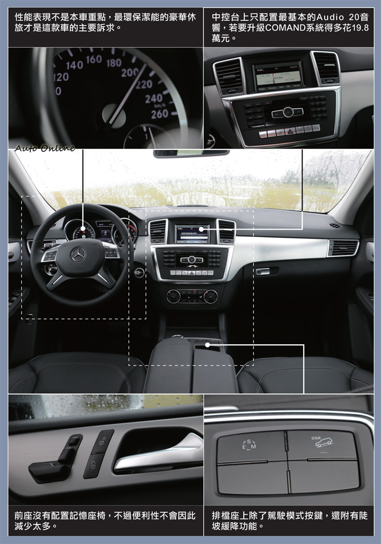 平順好開的特性![]() 雖然前面花了不少篇幅介紹BlueTEC引擎使用的技術,不過在試駕報導中,對於環保科技的議題還是就此打住,畢竟我們和大多數的消費者一樣,對於車輛的實際性能表現還是比較感興趣。根據以往的經驗,同樣200hp出頭的2.2升柴油引擎,如果放在GLK這種體型的車,絕對可以用「非常好開」來形容,不過M-Class可是淨重超過2公噸的大傢伙!沒有300hp以上的引擎,真的能夠撐得住場面嗎?到底會不會因為追求綠能而犧牲LSUV該有的動能?在上路前我們也不敢保證。 ![]() ▲柴油引擎運轉聲不大,怠速時反而風扇聲比較明顯。![]() ▲2.2升柴油引擎的特性為加速平順,S模式下才能感受較直接的反應。