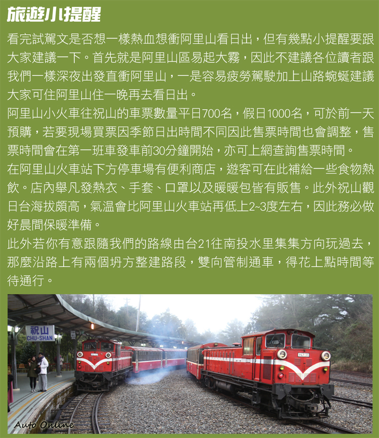 前情提要![]() 必須承認這個長途試駕計畫多少帶有點賭氣的味道,加上一個失戀的編輯想去看日出,而另一個貪吃的編輯想吃阿里山鐵路便當。因此整個試車行動就選在深夜從台北出發,直殺阿里山看日出。