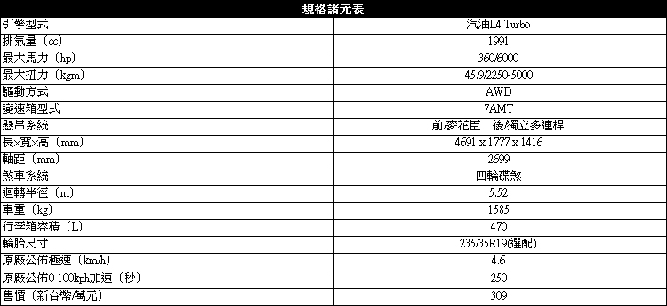 ![]() ▲底盤如同賽道的調校風格,但基本的舒適性還是很具水準。實際開起來的整體表現與A45 AMG相去不遠,除了油門反應相當迅速,加速能力絕不會讓人失望。它的懸吊特性同樣偏硬,顯然是為了迎合重口味玩家的設定,加上靈敏而精確的轉向,熱愛供彎的人肯定喜歡。我們嘗試在郊區安全路段以更快的車速通過帶有起伏的連續彎,立刻發現它的煞車過程並沒有想像中線性,效率極高行程卻很短,活像是賽道用的調校風格,得多試幾次才能找到不會讓電子系統介入的踩踏方式。由於扭力湧現的速度比預期快很多,貼背感很明顯,囂張的排氣聲浪可能也是引誘駕駛捨不得把右腳移開油門踏板的元兇,加上ESP處理大馬力車的能耐通常會被高估,所以在還沒習慣之前,不要一起步就大腳油門去試它的能耐,這只能試出保險額度夠不夠而已。