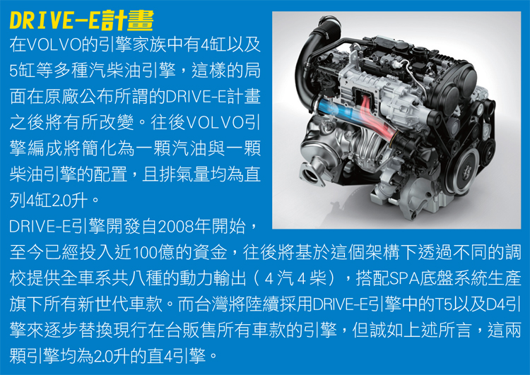 新擎 新變速箱![]() ▲2014的S80主要變異在於引擎與變速箱,外觀幾乎沒有變化。上期我們到替各位讀者介紹了所謂DRIVE-E引擎編成。原廠目前第一期推出的DRIVE-E系列引擎共有T5、T6以及D4三種動力版本。台灣先期引進的則是T5以及D4兩種,也將逐步替換掉現行在台販售車款的引擎。 ![]() ▲國際富豪首波規劃將DRIVE-E引擎中的T5與D4引擎逐步替換台灣現行所有車款。DRIVE-E引擎運用的科技簡單來說有幾點,1.提高供油壓力至200bar,讓燃料霧化更均勻2.減少引擎內部的動能耗損與磨耗3.電控水幫浦,可以讓冷車更快達到工作溫度4.修改燃燒室形狀與改善進氣口5.透過整合式排氣頭段讓廢氣排出壓力更平均,減少渦輪遲滯。 有了新引擎與新科技外,與動能傳遞息息相關的就是變速箱了。過去VOLVO使用的Geartronic 6速自排變速箱如今進化到8速。這顆由日本Aisin八速變速箱重量不到百公斤,長度也僅比原本的六速變速箱長28mm。 原廠冀望透過多檔位密齒比的的分配讓引擎可以維持在理想的轉數域,除了可以提升燃油效率外還可以讓換檔過程更為平順。