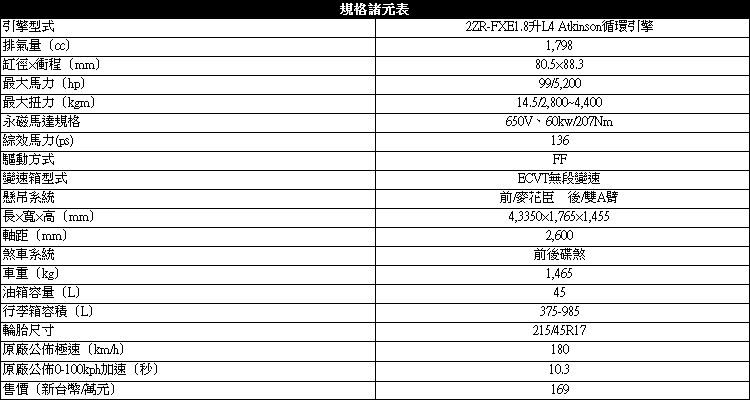 以節能動力導向動力輸出![]() ▲1.8升代號2ZR-FXE直列四缸Atkinson循環引擎與兩顆MG永磁電動馬達。改款後的CT 200h維持一顆1.8升代號2ZR-FXE直列四缸Atkinson循環引擎與兩顆MG永磁電動馬達。單純內燃機引擎最大馬力有99ps/5200rpm,最大扭力則有14.5kgm/2800~4400rpm。如果再加上兩顆MG永磁電動馬達,綜效馬力比起小改前提升兩匹來到136ps。透過ECVT無段變速箱加持,靜止加速到100km/h為10.3秒,最高極速設定在180km/h,能源局測出平均油耗為23.3km/l。不過其實單看帳面上的數據,可以發現CT 200h雖然外觀很運動化,整體動力呈現卻是趨向節能。