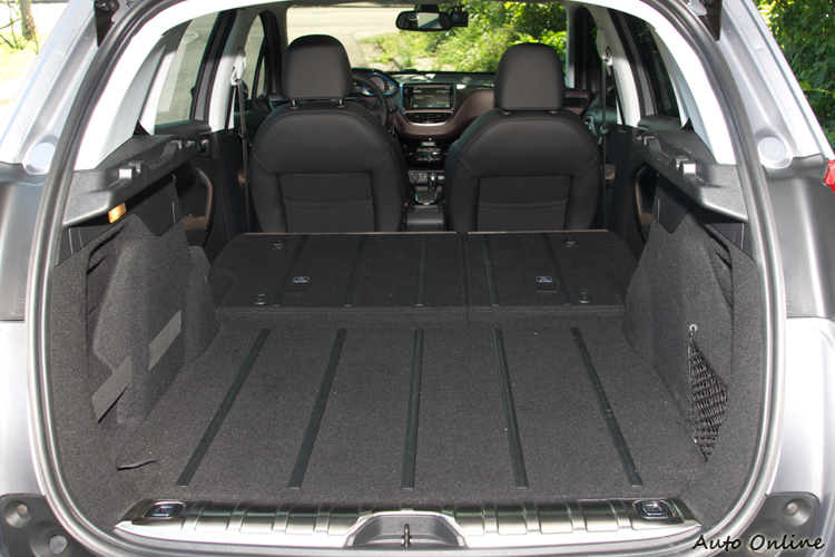 後行李廂空間為350公升,把後座椅背向前放倒後的容積則達到1194公升。重點是尾門開口形狀與行李廂空間形狀都很完整,沒有被什麼突出物去擋到。座椅傾倒後的行李廂地板非常平整沒有高低差,且有裝有軌道條方便行李物品在內部的前後移動。所以在行李物品置放的實用性上比不少對手都要好。
