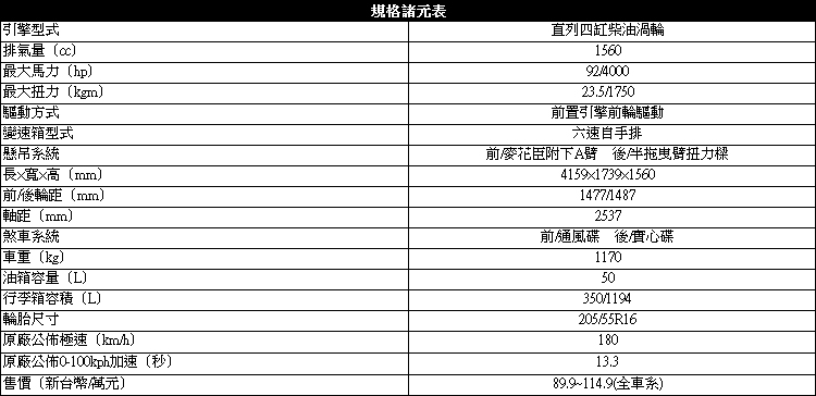 引擎的動力輸出表現算是中規中矩,油門反應溫溫、加速不會給你什麼push的感覺,但應付高速道路或山路爬坡等情況還是足夠,特別是在1750-3000rpm這段中段引擎轉速帶的扭力輸出發揮得相當不錯。26.32km/l的平均油耗對於在乎油耗的人來說相信眼睛為之一亮。